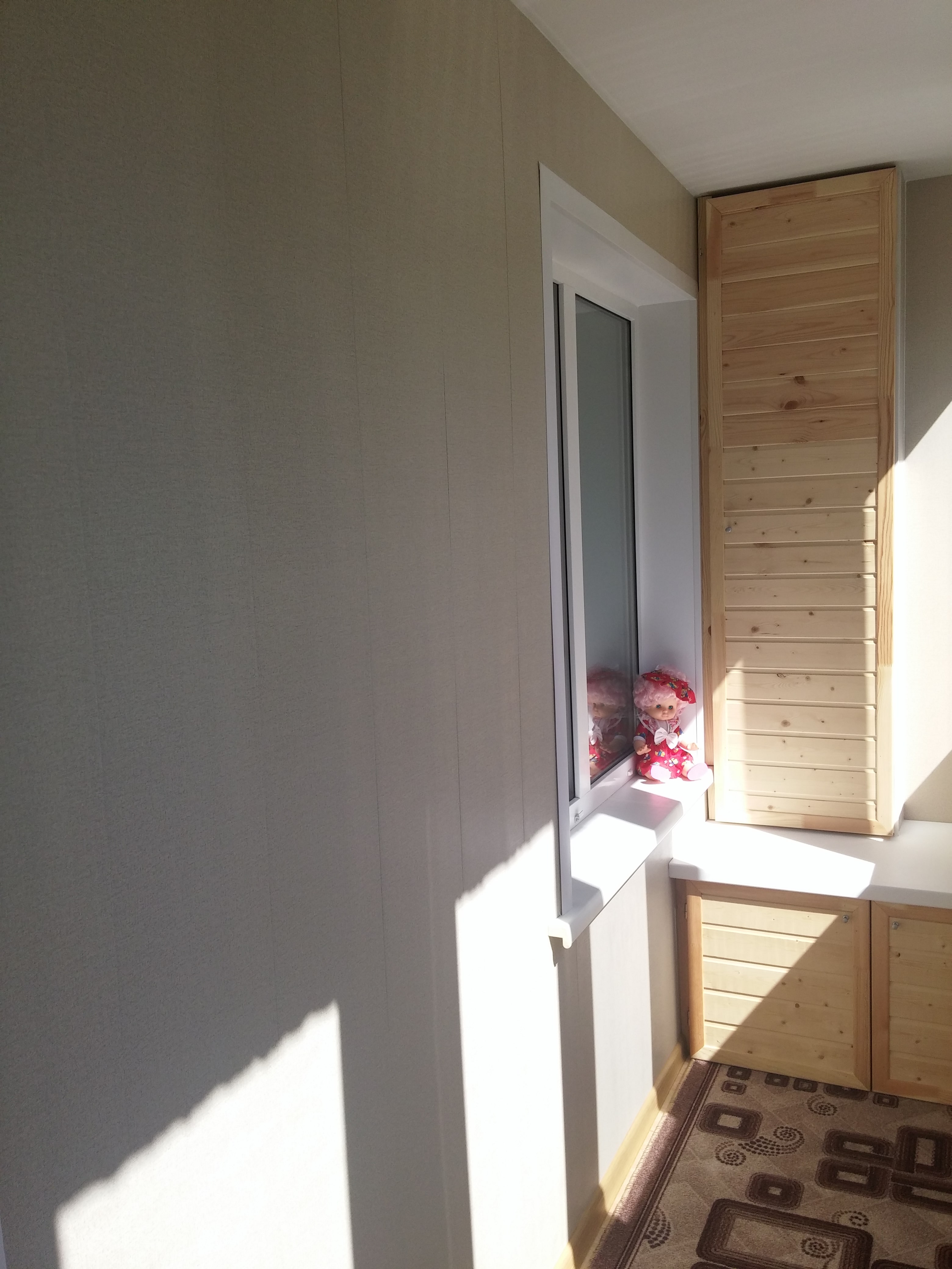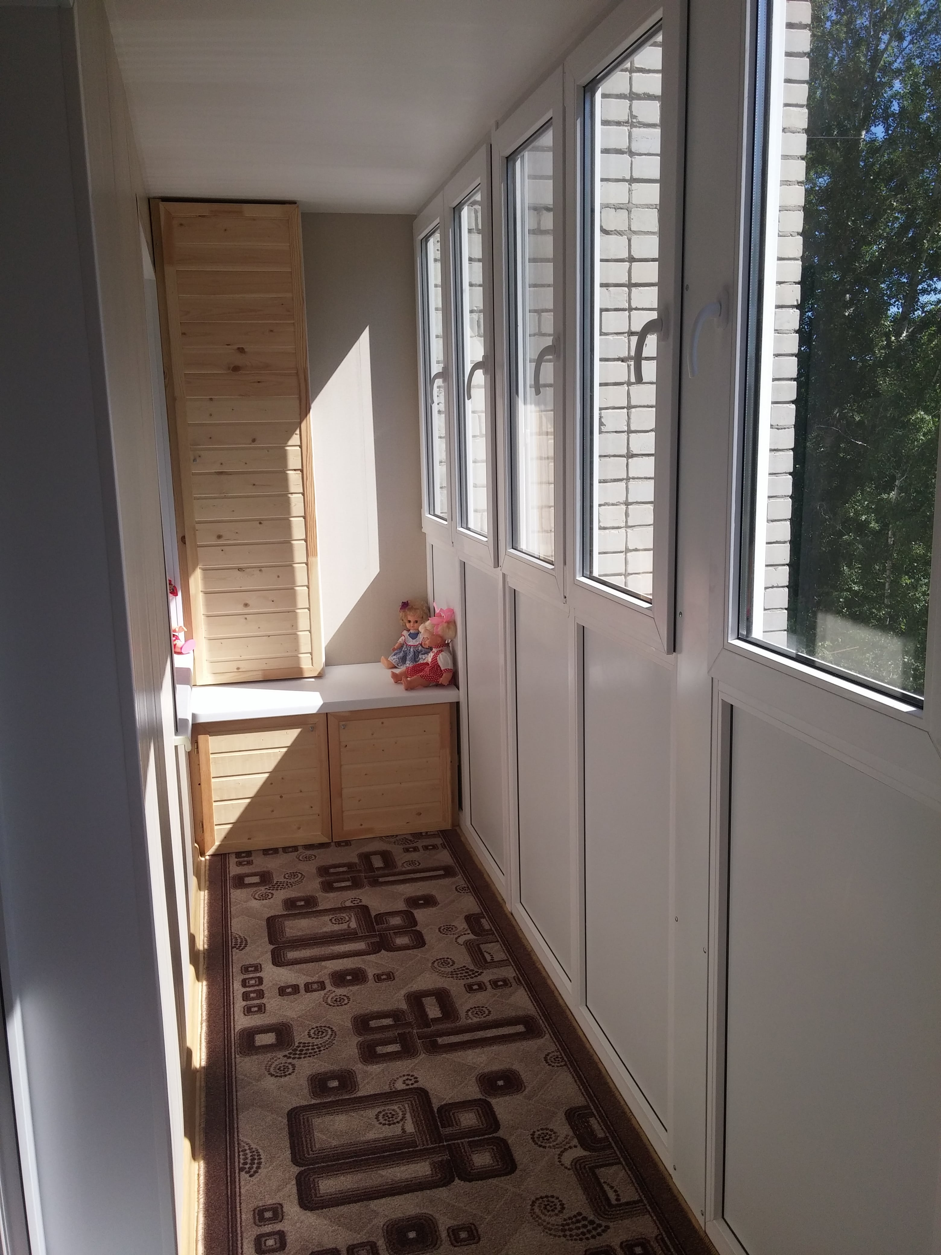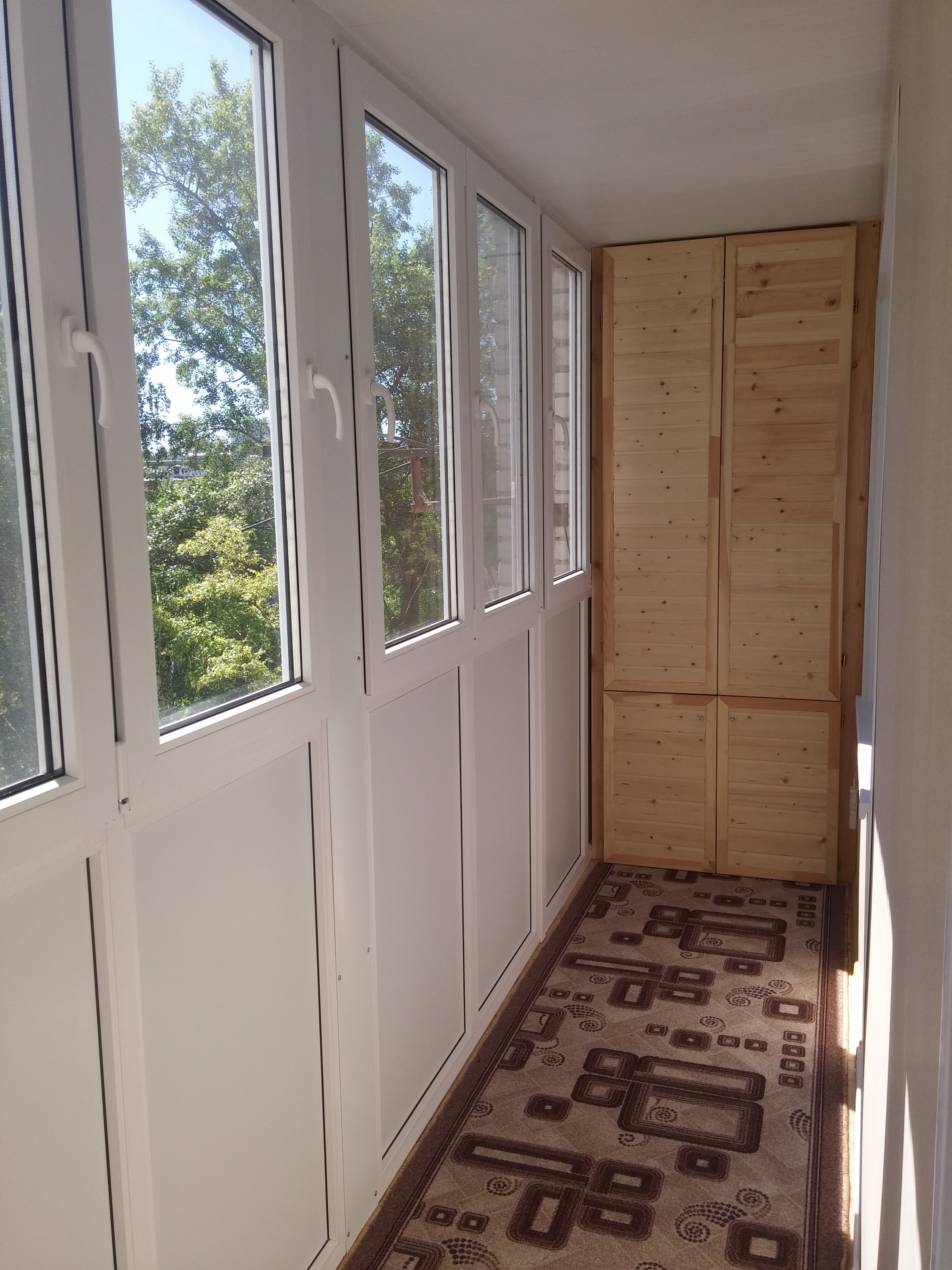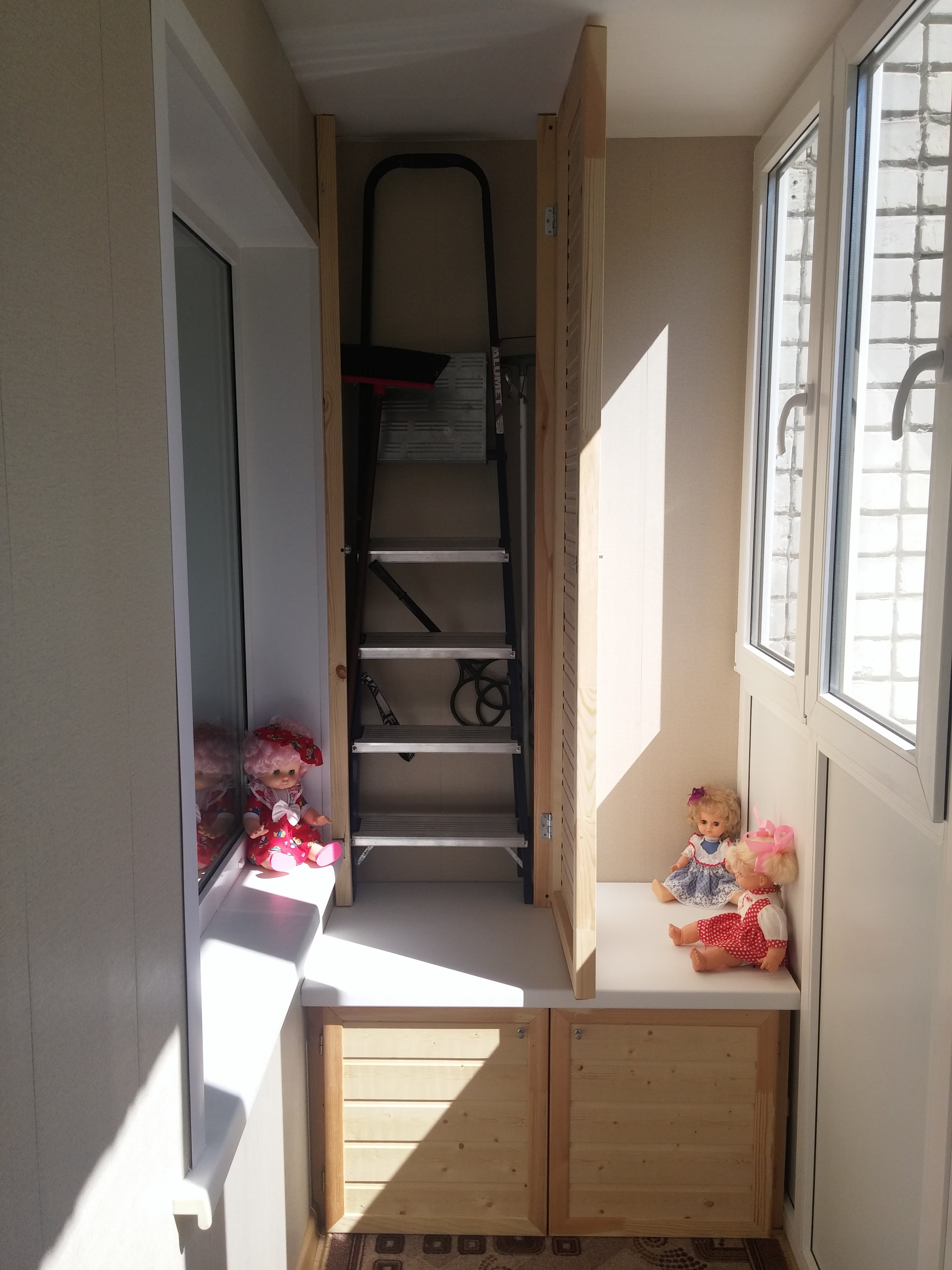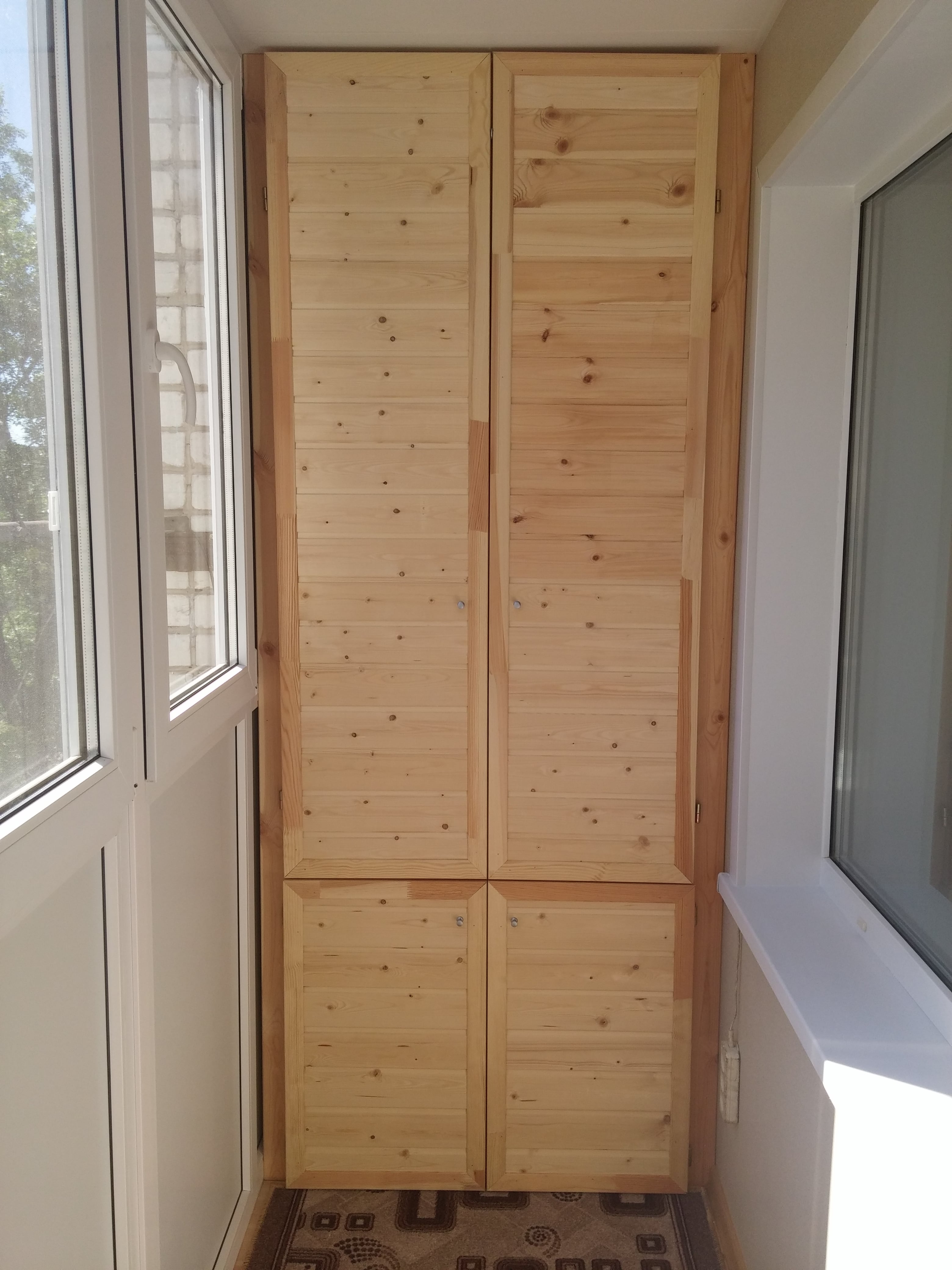 • По бокам балкона собраны шкафы с дверками из евровагонки на деревянном каркасе.