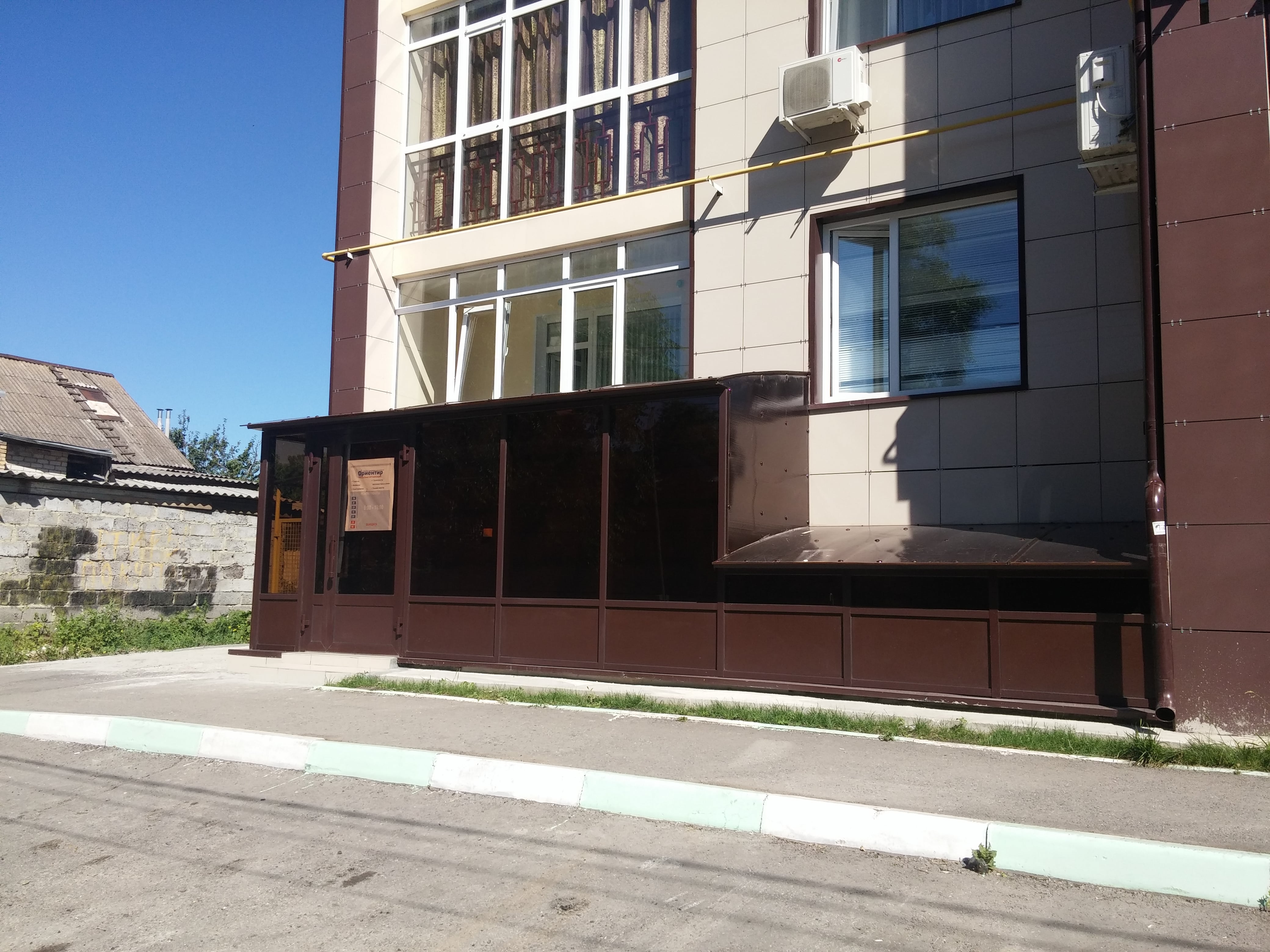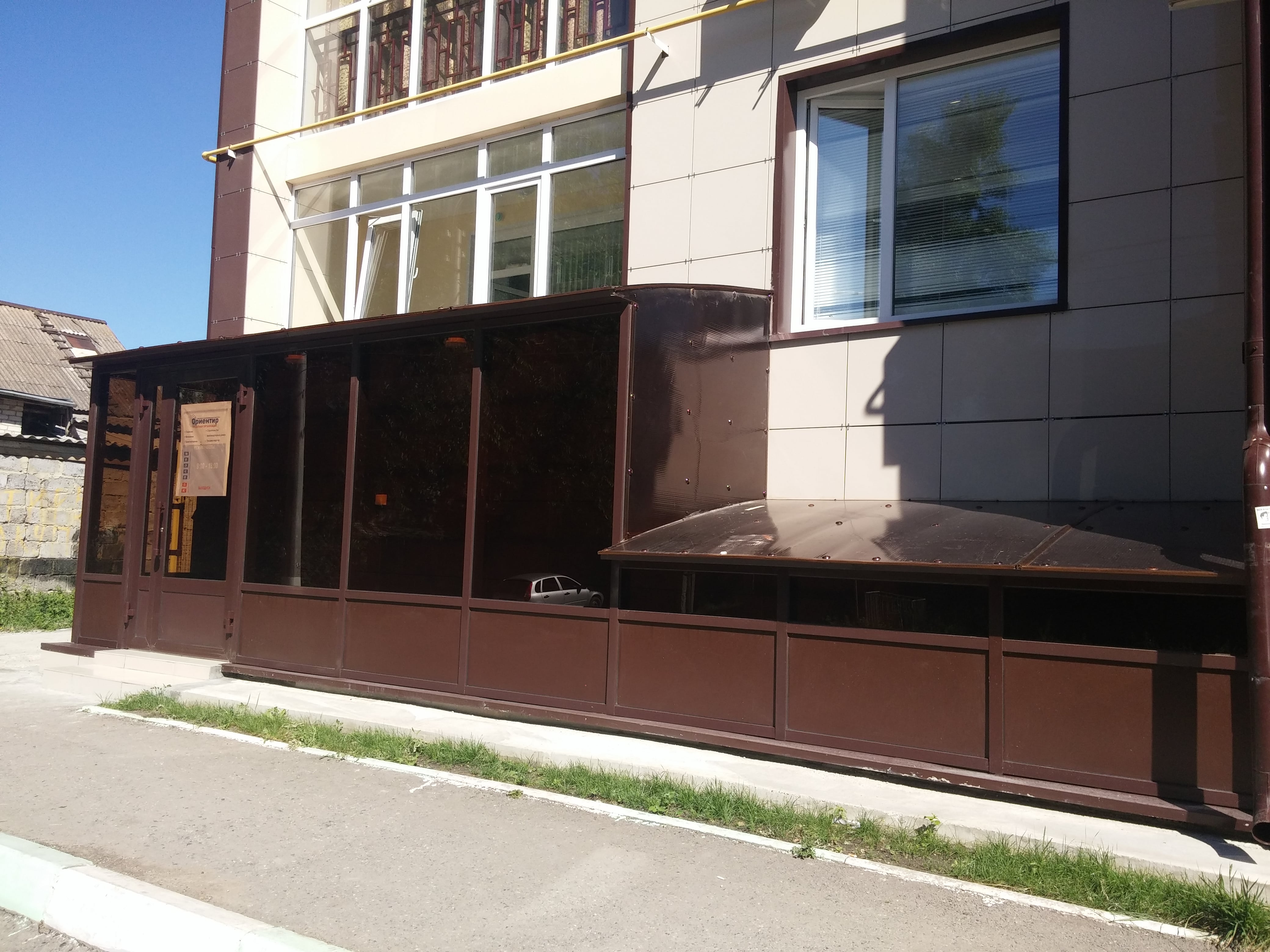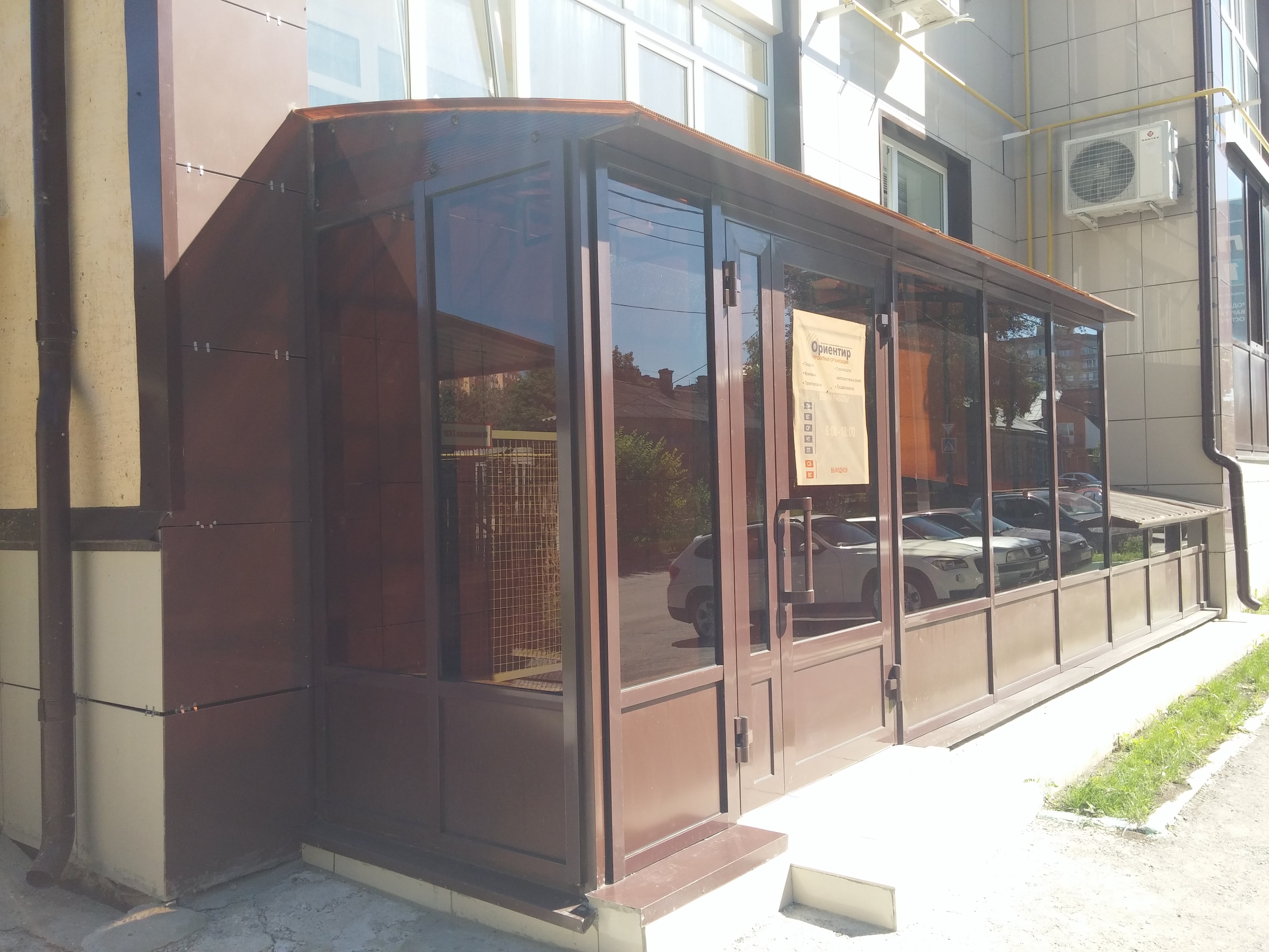 Крыша тамбура выполнена из сотового поликарбоната на металлокаркасе. Фасад из алюминиевого профиля Татпроф 50300 с заполнением тонированными стеклопакетами. Дверь из алюминиевого профиля ТП45 в «теплом исполнении».
