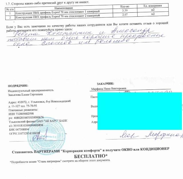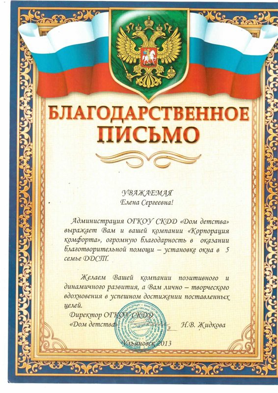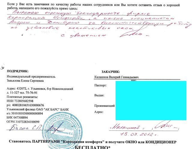 «… Выражаю огромную благодарность фирме «Корпорация Комфорта, а именно специалистам Андрею и Дмитрию за высококачественную работу по установке пластиковых окон. Калашнов Валерий Геннадьевич.»