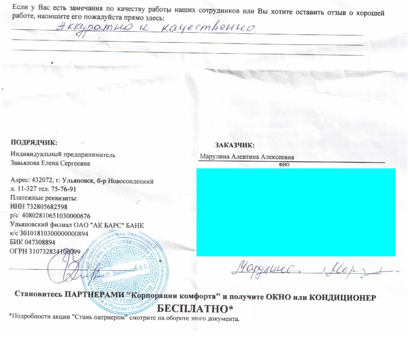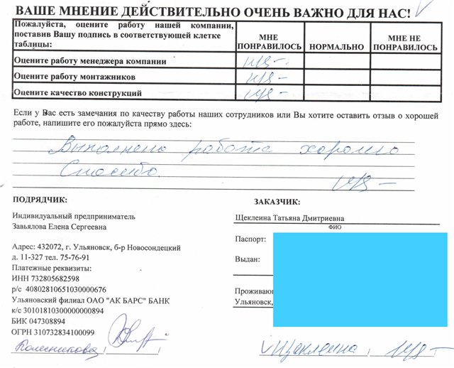 «… Выполнены работы хорошо. Спасибо! Щеклеина Татьяна Дмитриевна»