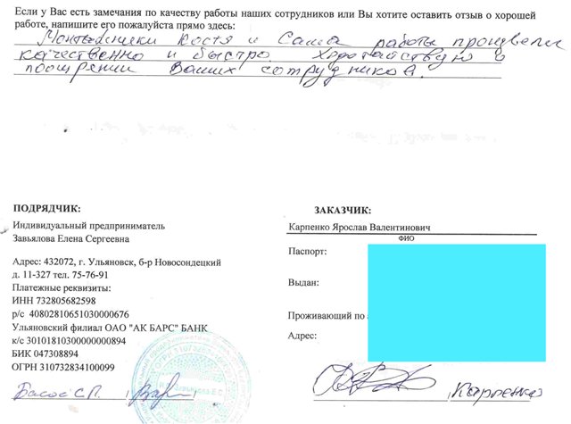 «… Монтажники Костя и Саша работы произвели качественно и быстро. Ходатайствую о поощрении Ваших сотрудников. Карпенко Ярослав валентинович»